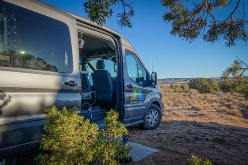 Travel and Share Space with Other Guests – Four people share a large van together.