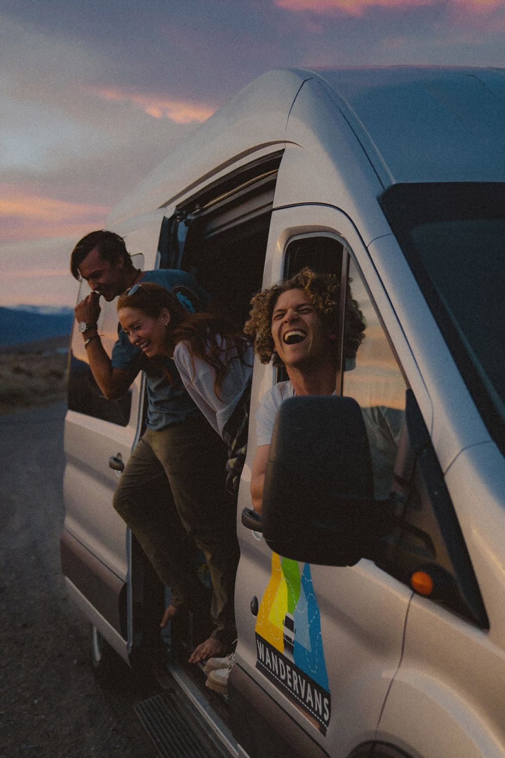 Three people share a medium van together.